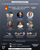 Join us for our Winter Gala Dinner, commencing with doors opening at 3:00 PM, with main event seating following at 4:00 pm, followed by a brief opener, and a plated meal served promptly at 5:00 PM, featuring an entrée with two sides to provide nourishment while fostering meaningful connections through networking at designated tables among Iowa's entrepreneurial community. The evening continues with a lineup of keynotes and panels featuring three distinguished speakers to sustain momentum and emphasize interaction: